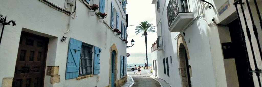 Ahora subimos un poco, porque hay que ver Sitges desde arriba para entenderla de verdad. El casco antiguo se despliega como un laberinto blanco de callejuelas estrechas, plazas escondidas y balcones que parecen puestos ahí específicamente para enamorarte del Mediterráneo.